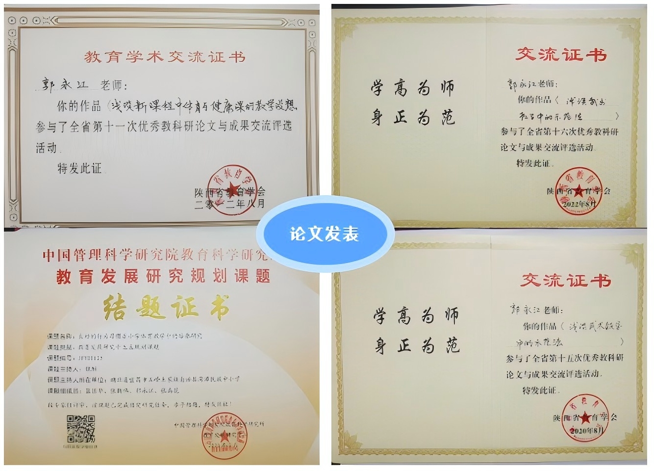 郭永江在體育教學中是把好手,他把軍人的精氣神、嚴紀律帶到了學校,也把一位體育老師的鐵漢柔情展現得淋漓盡致。課間活動時間,他總會帶著孩子們喊出響亮的口號,邁著矯健的步伐,學生們姿勢規范、身板挺拔,像一位位“小軍人”。他善于學習,熱心鉆研教材,嚴格按照教學中的環節去組織教學,課堂中善于運用教學游戲,讓學生感受到體育的樂趣。利用課外時間開展武術興趣小組活動,為學生教授了《五步拳》《初級長拳》。體育課上,他結合部隊訓練的經驗,教學生站軍姿、走隊列、唱軍歌、打軍體拳,經過日復一日的訓練,孩子們總能在團隊訓練中做到干凈利落、整齊劃一,在“六一”匯演中,受到學校在場領導和師生的好評。撰寫論文《淺談武術教學中的示范法》《淺談新課程中體育與健康課教學設想》在陜西省體育論文評選中獲得省級三等獎,論文《淺談德育教學中的實效性》獲得漢中市三等獎,《淺談武術教學中的示范法》在2010年《東西南北.教育觀察》《漢中日報.教育周刊》雜志上公開發表,同時被入編到新中國成立60周年論文集中。部分論文、課題獲國家、省、市、縣級獎勵,多次被寧強縣委、縣政府評為優秀教育工作者。