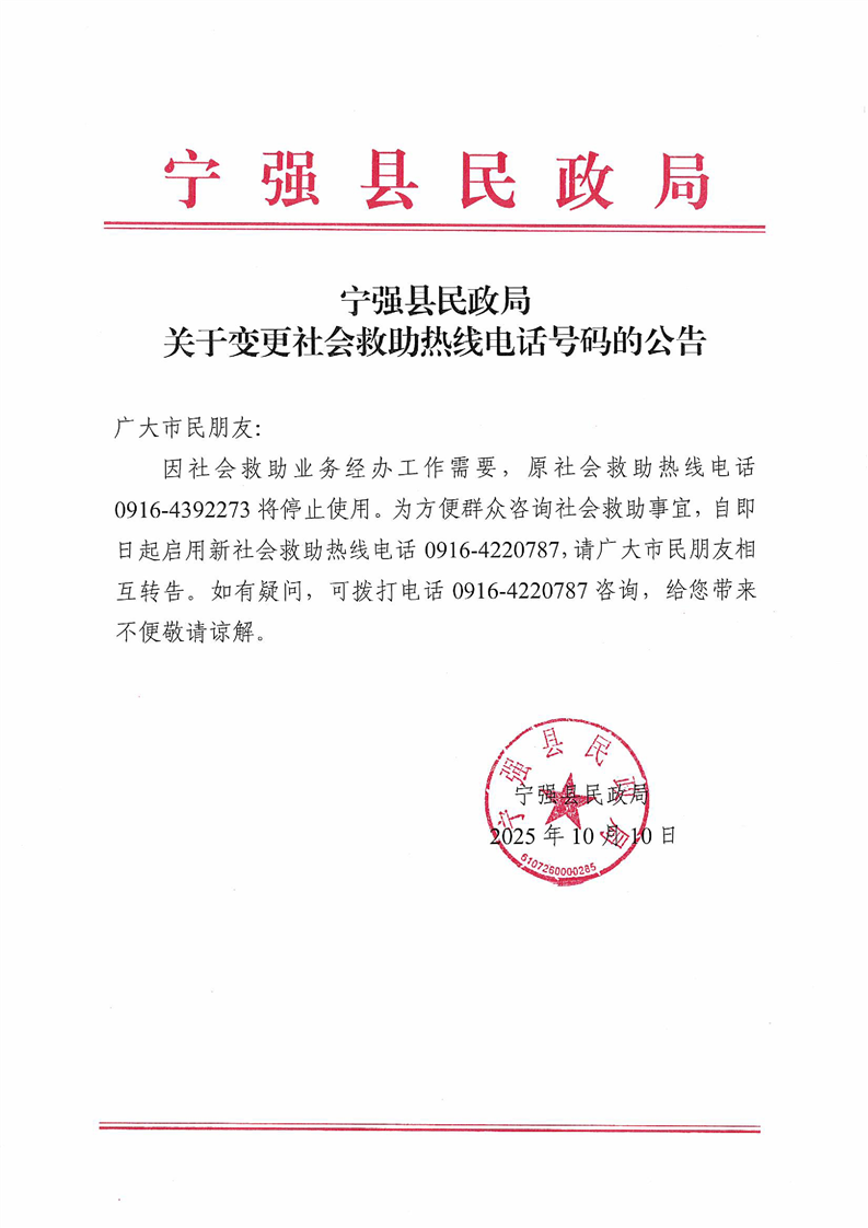 寧強縣民政局關于變更社會救助熱線電話的公告