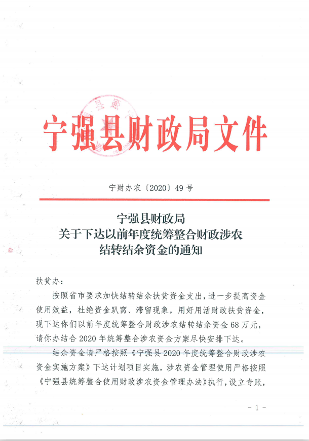 關于下達以前年度統籌整合財政涉農結轉結余資金的通知