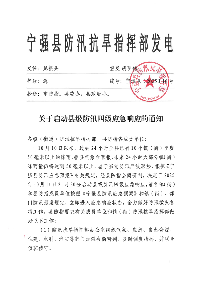 寧汛電【2025】16號關于啟動縣級防汛四級應急響應的通知